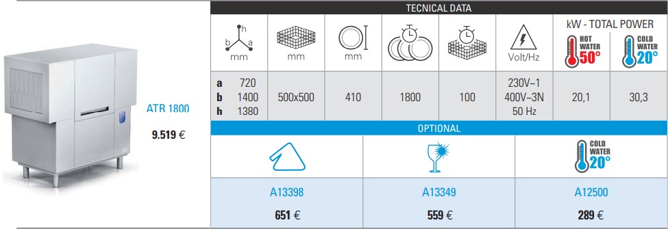 Επαγγελματικό πλυντήριο πιάτων – ποτηριών ATA ATR1800