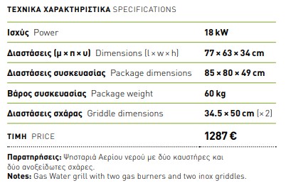 Ψησταριά αερίου με νερό στο συρτάρι. Δουλεύει με όλα τα αέρια (υγραέριο και φυσικό). Η πιο αξιόπιστη λύση για τον απαιτητικό επαγγελματία που θέλει τα ψητά του να ψήνονται ομοιόμορφα διατηρώντας την υγρασία και την γεύση τους αναλλοίωτες. Λειτουργεί με το νερό στο συρτάρι για την αποφυγή καπνών και φωτιάς κατά την διάρκεια του ψησίματος. Ομοιόμορφο ψήσιμο σε όλη την επιφάνεια χωρίς νεκρές ζώνες.